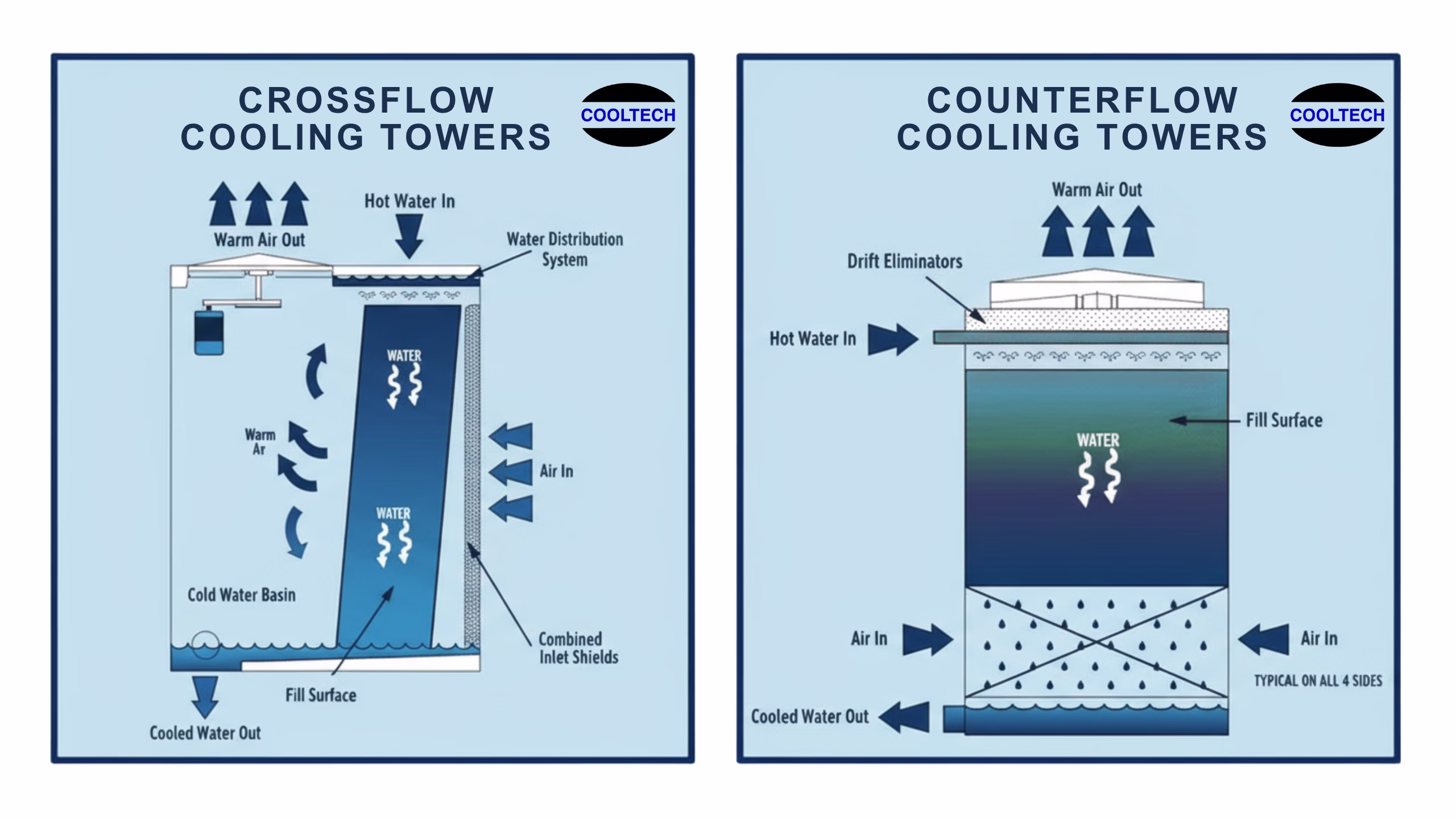 - In crossflow cooling towers, air moves sideways across the water that flows down. This is different from counterflow towers, where air moves up against the water.